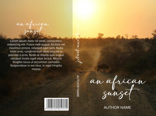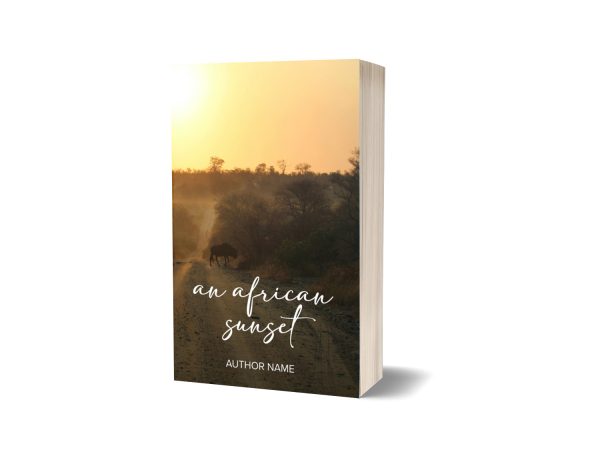 Details: African Sunset: Premade Book Cover. The cover contains an African sunset. Wildebeest crossing the dirt road. Safari, Sunset, Africa, Landscape. Suitable for Adventure, Drama, Love Story, Romance.
