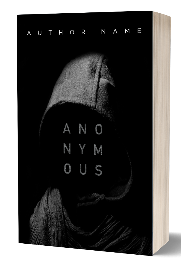 Details: Anonymous: Premade Book Cover. Horror Book Cover. Image of a hooded figure, their face is hidden. They are wearing a grey hoodie, the background is black. Suitable for horror, gothic, mystery genres.