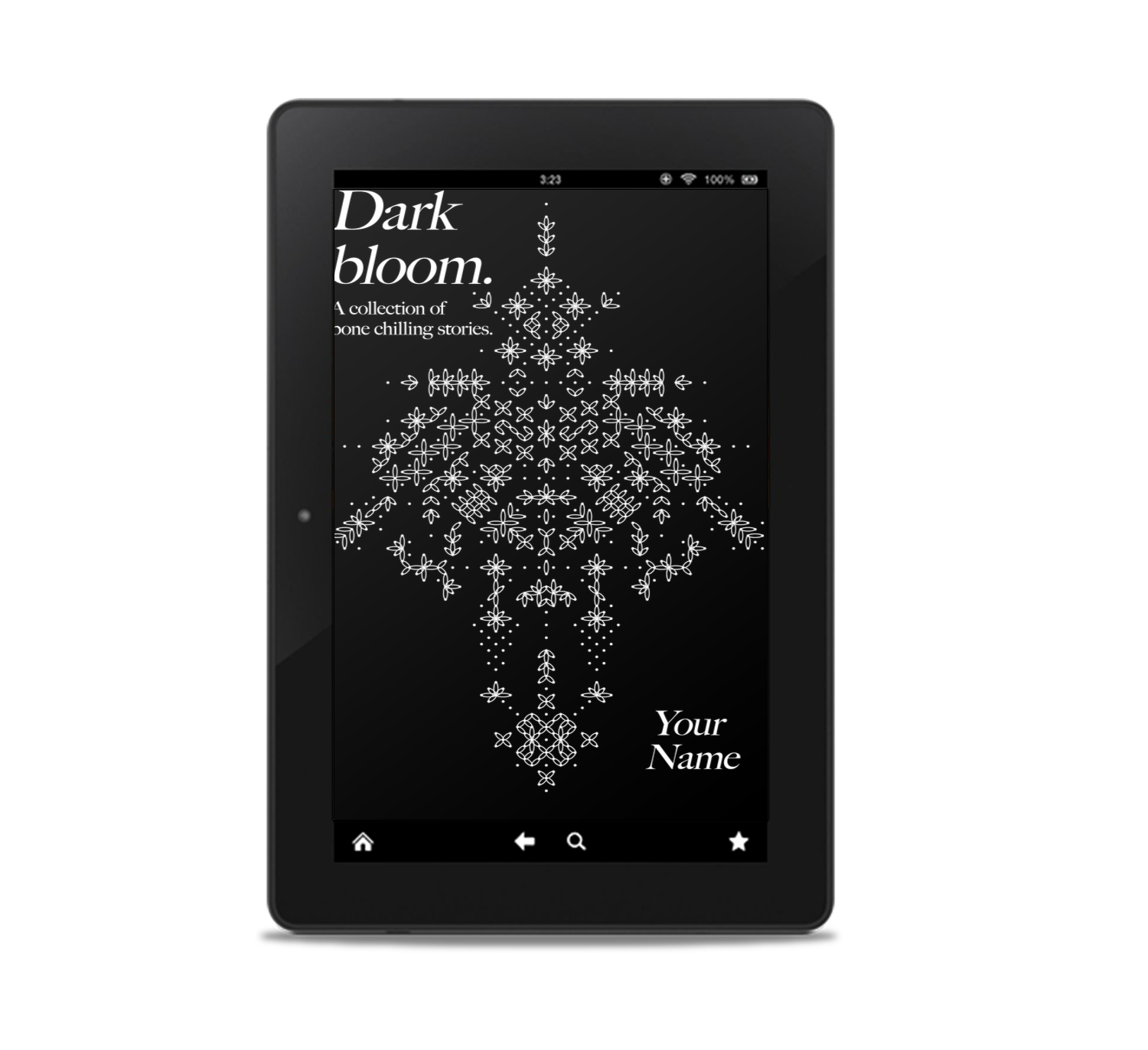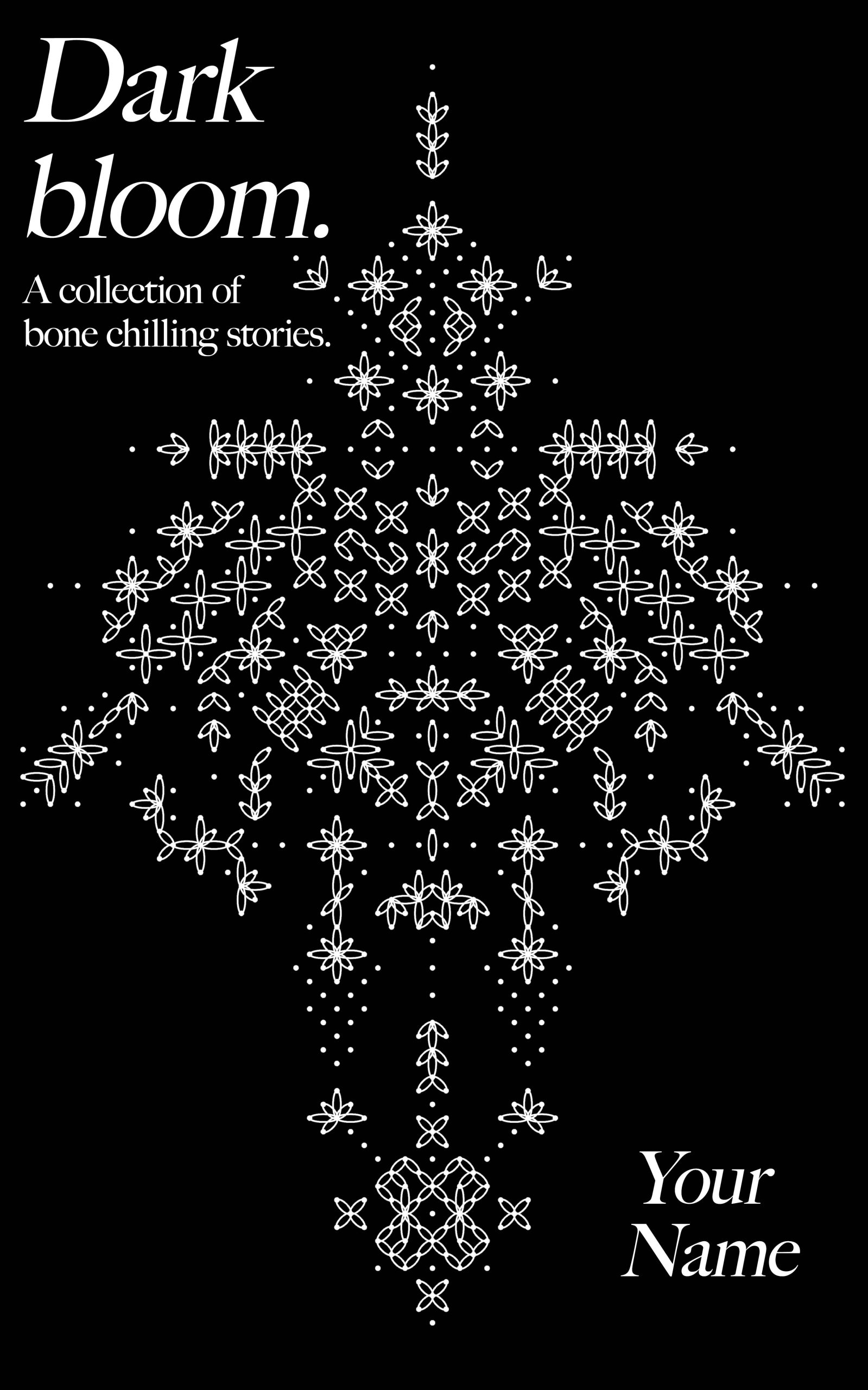 Details: Dark Bloom Premade Book Cover. Graphic, Dark, Black & White, Pattern. Suitable for Mystery, Crime, Sci-fi, Poetry.