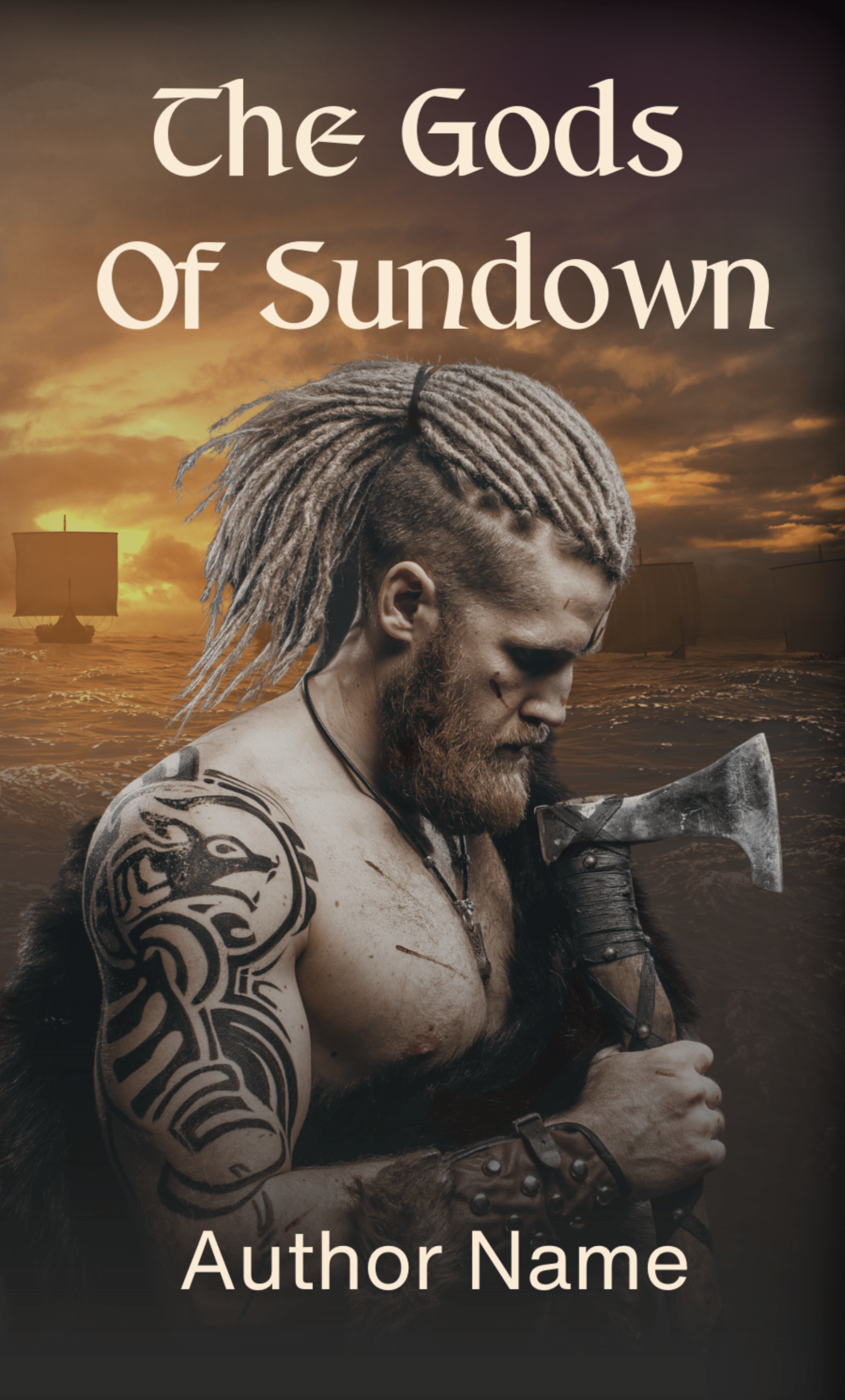 Details: Gods Of Sundown: Premade Book Cover. Image of a Viking warrior holding an axe. Suitable for historical, drama, action, adventure genres.