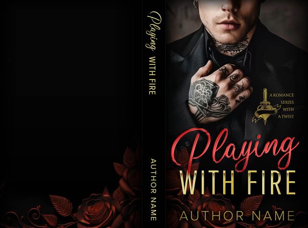 Details: Playing with Fire: Premade Book Cover. The cropped face of a handsome young man wearing a black satin suit. His neck is tattooed, as is his hand. He has an ear ring and a nosering.  The title uses a script font and a sans serif font. The script font is red shiny, satin, and the sans serif is gold. There is a golden badge icon of a heart and dagger. The background is black. Suitable for Romance (mafia, age-gap, enemies to lovers)