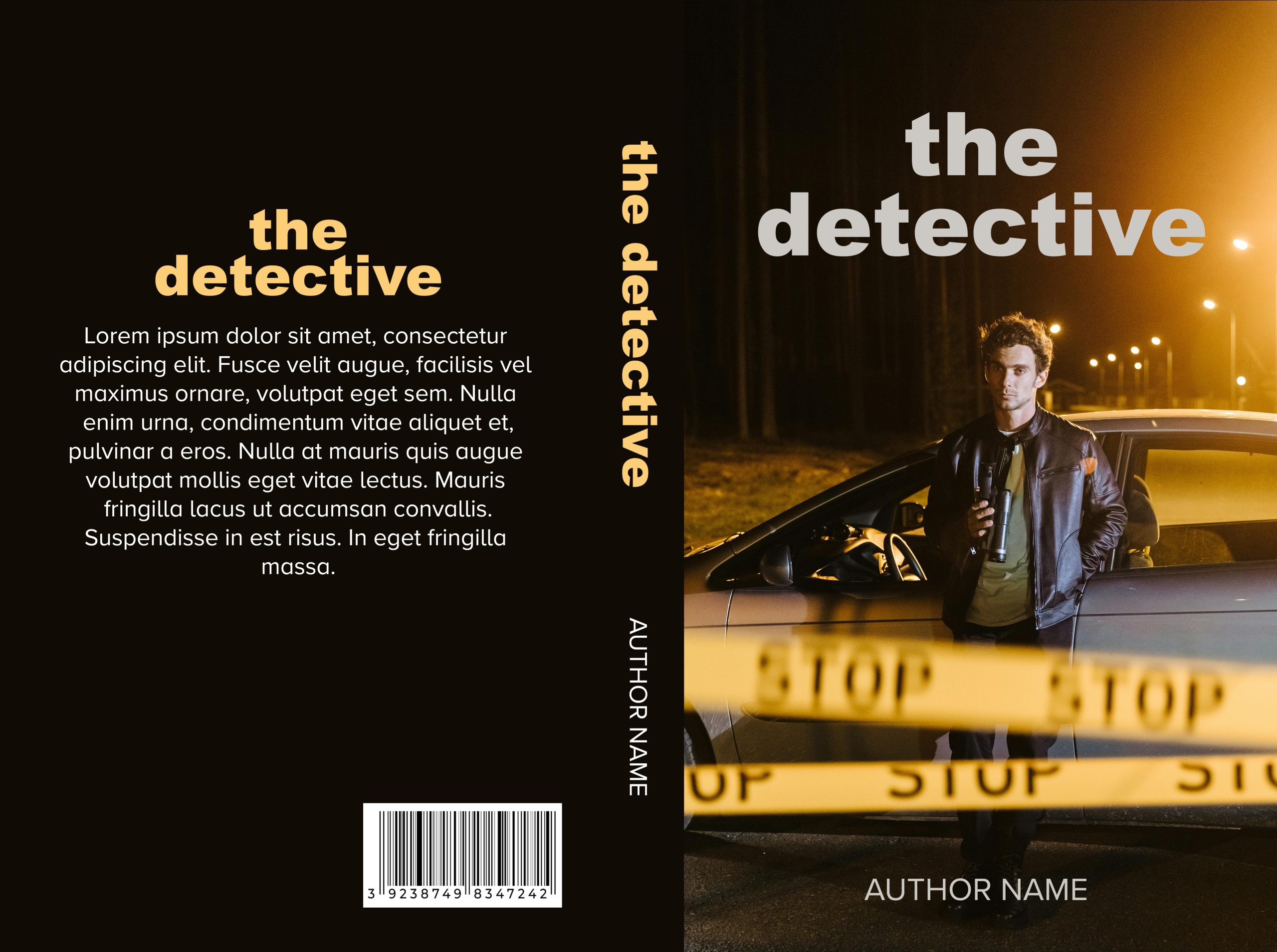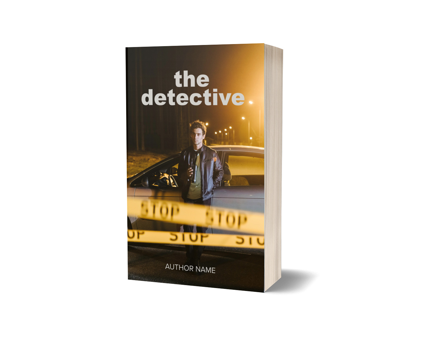 Details: The Detective: Premade Book Cover. The cover contains a detective standing next to his service vehicle. Police tape, crime ribbon, do not cross, crime, mystery, detective work, murder, mystery. Suitable for crime, mystery, drama, thriller.
