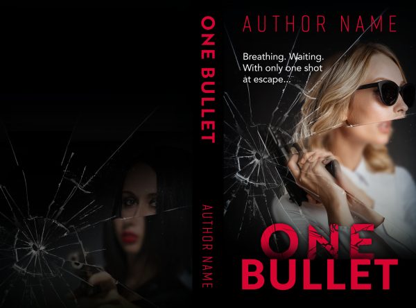 Details: One Bullet: Premade Book Cover. A blonde woman wearing dark shades stands poised and ready to shoot, her handgun pointing upwards. She is likely an agent, undercover cop or a detective. In front of her is a cracked glass windowpane, distorting her image. At the centre of the cracked glass is the hole of a bullet.  The title is bold, sans serif and blood red, with one of the words partially shattered. The background is black. Suitable for Fiction, Thriller, Mystery, Psychological Drama.