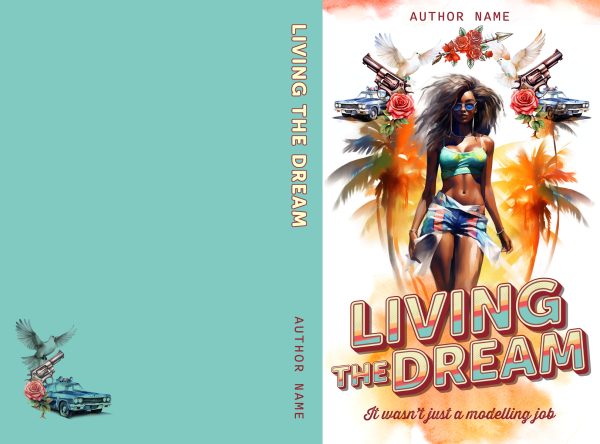 Details: Living the Dream: Premade Book Cover. Retro-style design of a gorgeous, sassy Afro-American or mixed race woman striding towards us wearing a crop top, tight jeans shorts and shades. Her hair is big and untamed. She is framed by brightly coloured palmtrees in shades of orange, handguns, roses, peace doves, and arrow and police cars. The title is multi-coloured, at an angle and has a retro 70’s design. Behind the title is a watercolour effect. Suitable for Non-fiction, Thriller, Chicklit.