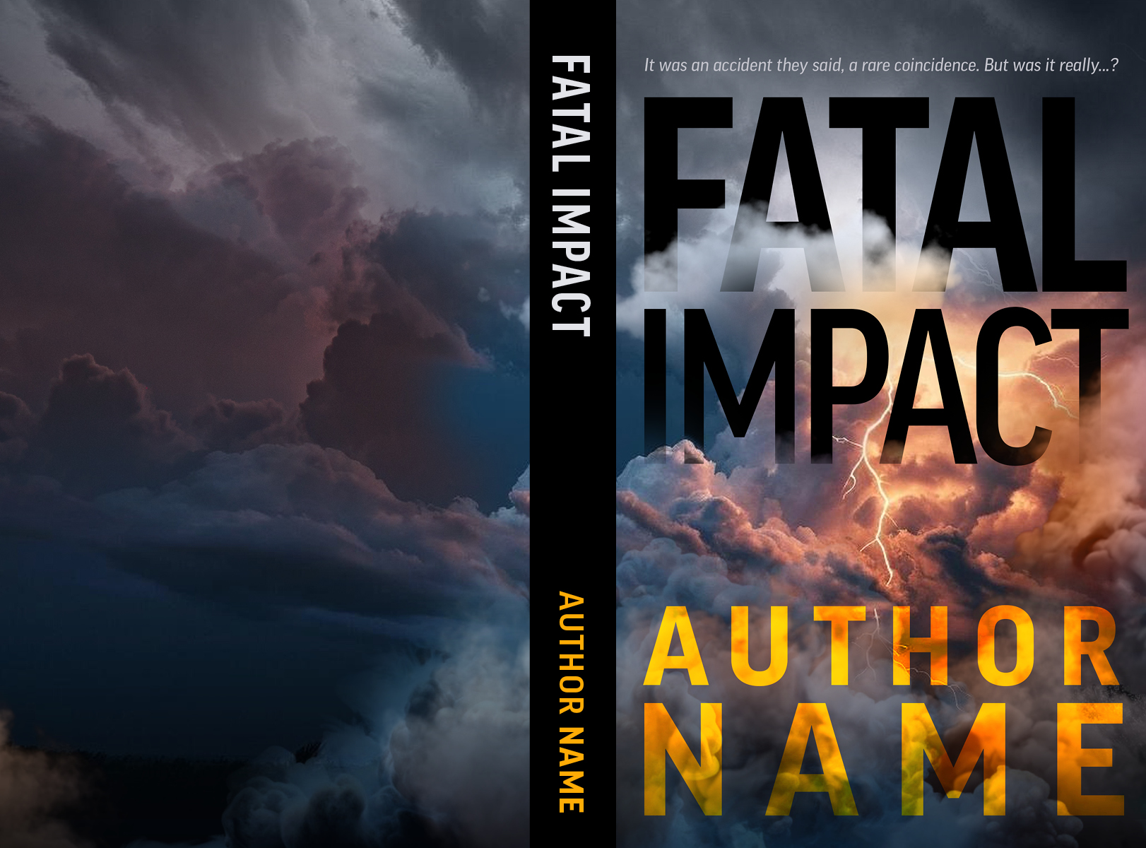 Details: Fatal Impact: Premade Book Cover. The black title is seen through large, looming thunder clouds in shades of greys, blues and moody oranges. Transparent clouds partially overlaps letters in the title. A bright lightning ray lights up the clouds behind the title. The title is bold and sans serif. The author name is bright yellow and orange with the clouds visible through the letters. Suitable for Fiction, Thriller, Mystery, Action.