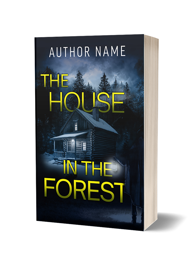 Details: The House in the Forest: Premade Book Cover. A mysterious man in a long jacket, holding a lantern, stands in the shadows looking at a small wooden log cabin with a porch. Behind the house is a dark forest. It is night-time and the lights are on inside the cabin. There is smoking coming from the chimney. The title font is a luminescent yellow font with soft shading. The title partially falls behind the cabin and the lantern. Suitable for Fiction, Thriller, Mystery, Horror, Psychological Drama, True Crime.