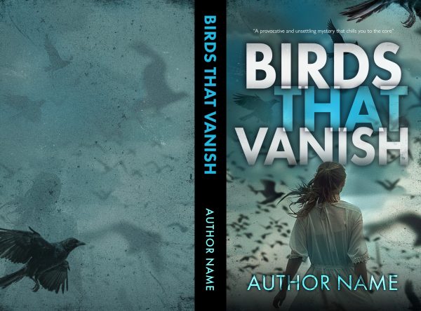 Details: Birds that Vanish: Premade Book Cover. The cover shows the back of a young woman looking up at a grey and windy sky filled with dark birds flying by. She is wearing a sheer, white dress, and her dark blonde hair is tied in a loose ponytail. The birds are ravens or crows and are all out of focus apart from the partial wings and claws towards the top of the cover. There is a scratchy, grungy texture along the sides of the image. The title is bold, sans serif, and partially transparent – the letters overlap each other. Suitable for Fiction, Thriller, Mystery, Horror, Psychological Drama, True Crime.