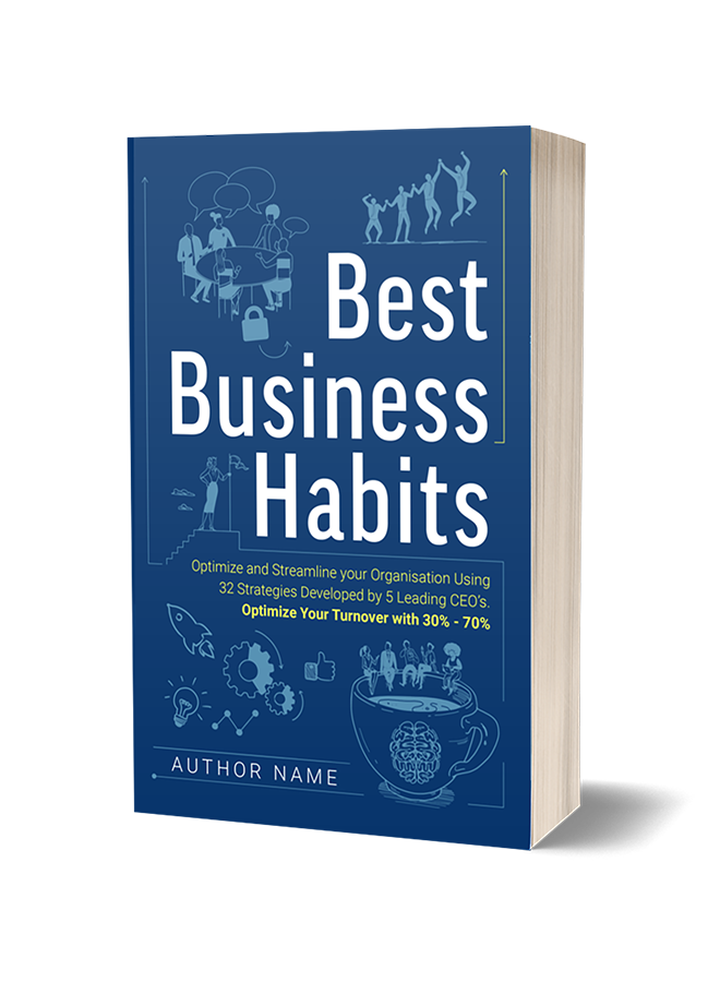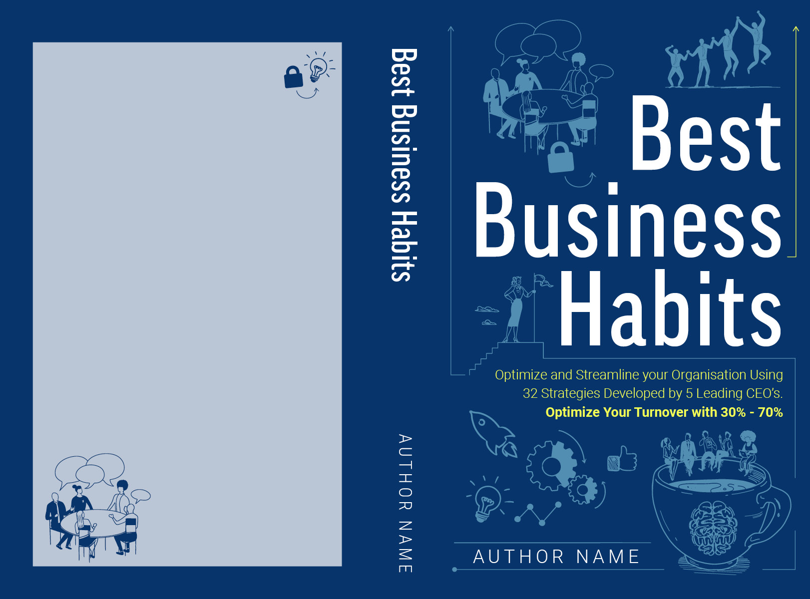 Details: Best Business Habits: Premade Book Cover. Various business-inspired doodle-style illustrations (people in meeting, cogs, lightbulbs, arrows, flag, rocket, brain, unlocking success). White sans serif title on a dark blue background. Suitable for Non-Fiction, Self-help, Business, Economics.