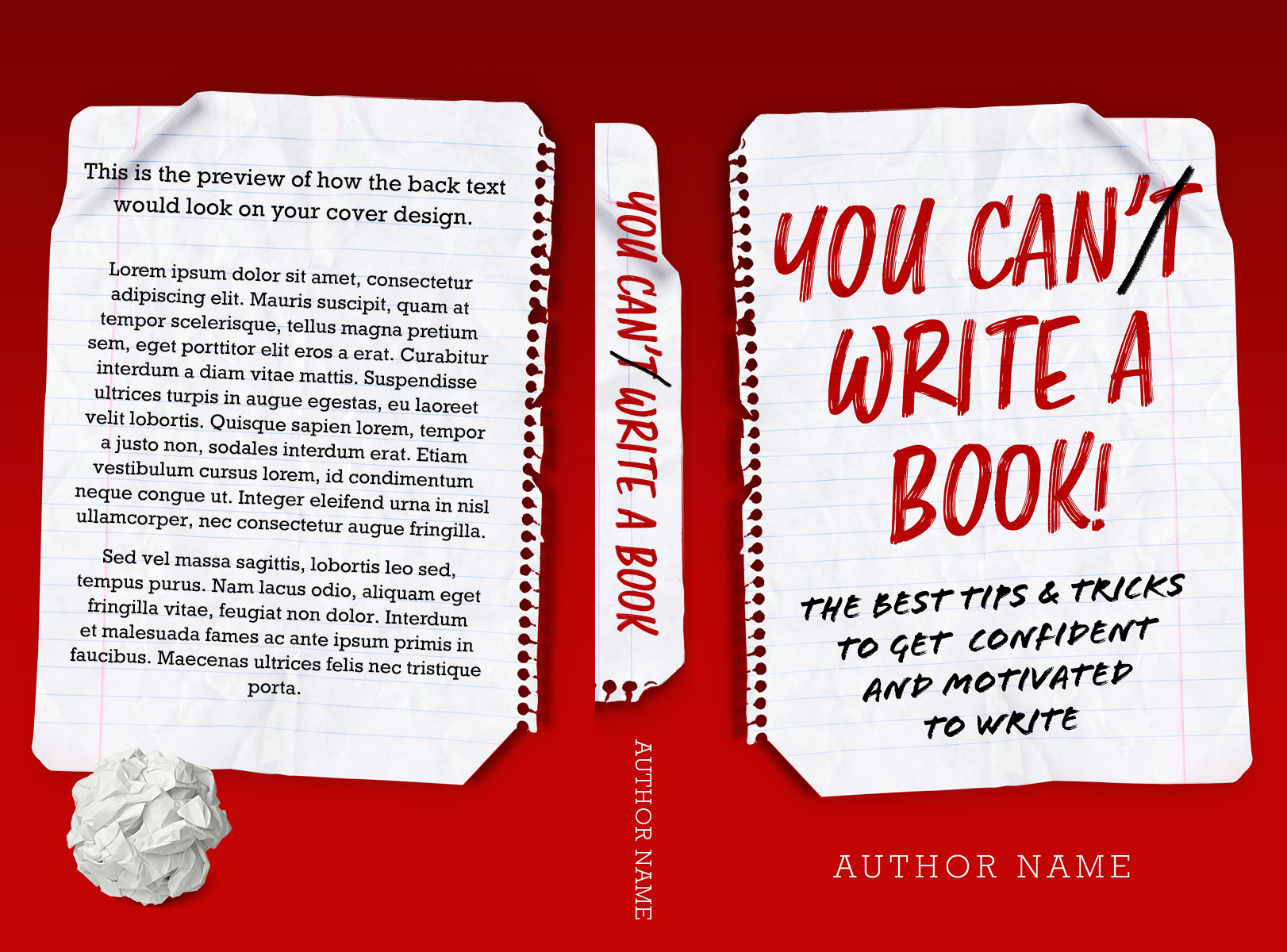 Details: You Can Write a Book: Premade Book Cover. Red handwritten title with the letter ‘t’ crossed out in the word ‘can’t’. Shown on a lined paper that has been torn out of a notebook. Suitable for Non-fiction, Self-help, Memoirs, Autobiography, Education, Travel.