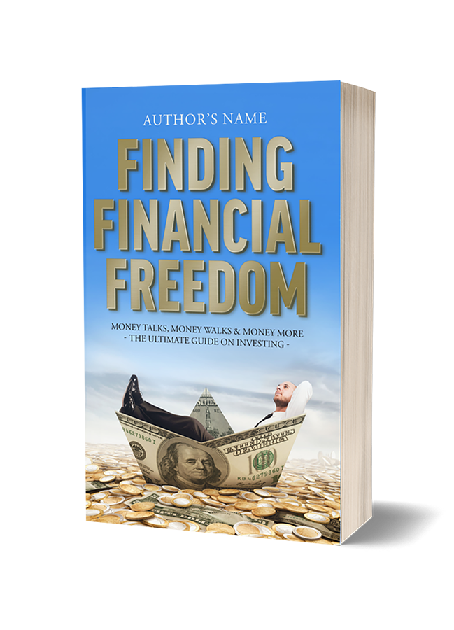 Details: Finding Financial Freedom: Premade Book Cover. A businessman relaxes in a folded paper boat made of a giant dollar bill, sitting on a sea of coins. He looks up at a large gold coloured title on a bright blue background. Suitable for Non-fiction, Self-help, Business, Wealth Management.