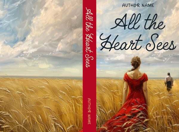 Details: All the Heart Sees: Premade Book Cover. The back of a woman in a beautiful long, red dress gazes out across a billowing wheat field at a man with his back turned. They are both standing in a yellow wheat field, and the sky looks a little stormy. The image has an illustrated, painted, effect. The fonts are in a handwritten style. Suitable for Fiction, Historical Romance, Chic Lit, Young Adult, Drama.