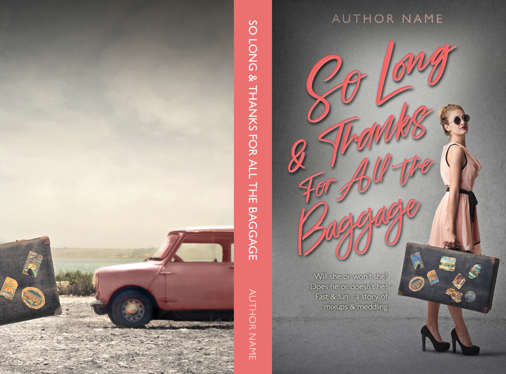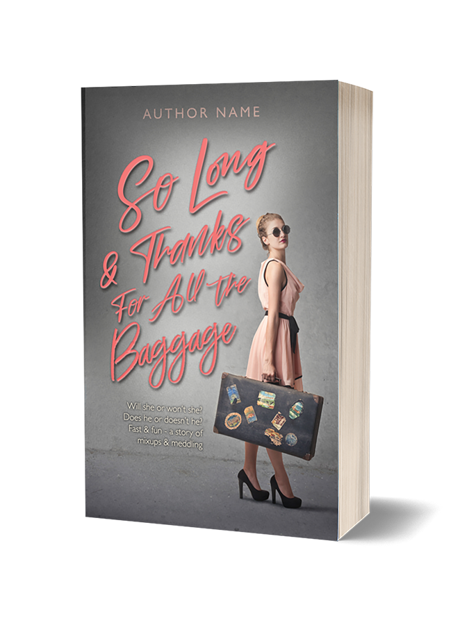 Details: So Long & Thanks for All the Baggage: Premade Book Cover. An attractive young woman in a retro dress, high heels and sunglasses carries a vintage suitcase. She has attitude. The background is mottled grey with a salmon pink script-style title font. Suitable for Fiction, Chic Lit, Romance, Young Adult, Drama, Humour.