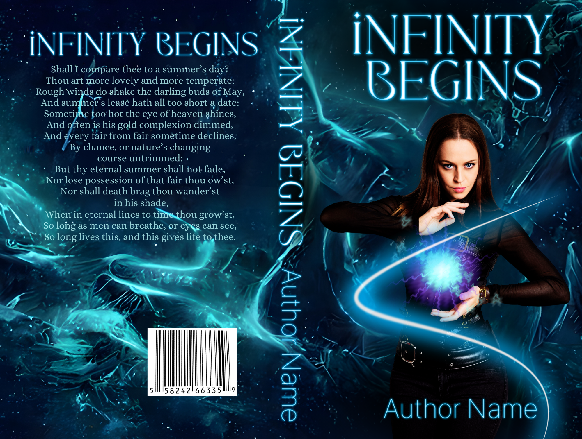 Details: Infinity Begins: Ready Made Book Cover. Portrait of a woman, wiccan, magical, sci-fi, fantasy, occult, spells, orb, time travel.