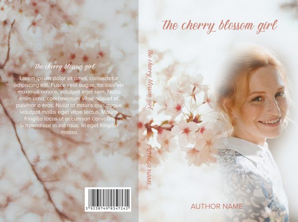 Details: Cherry Blossoms: Ready Made Book Cover: The cover contains cherry blossoms, sakura, flowers, woman smiling, floral dress. Suitable for Romance, Love, Chick Lit, Drama.